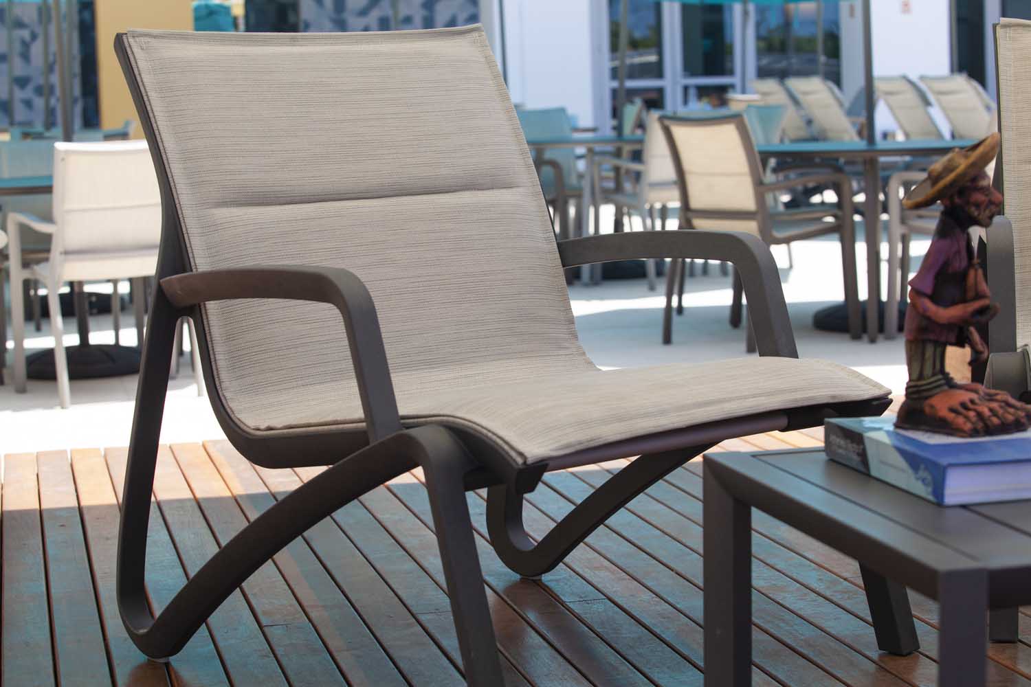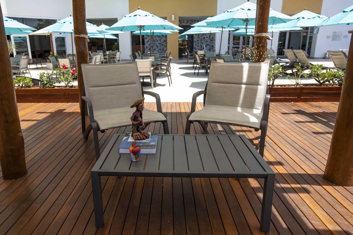 Feito em alumínio laqueado para maior durabilidade, este tampo de mesa complementa perfeitamente as estruturas da espreguiçadeira Sunset, cadeira, banqueta de bar e assentos profundos Conversational. Com um design de ripas abertas, é fácil de montar, garantindo qualidade e estilo.
